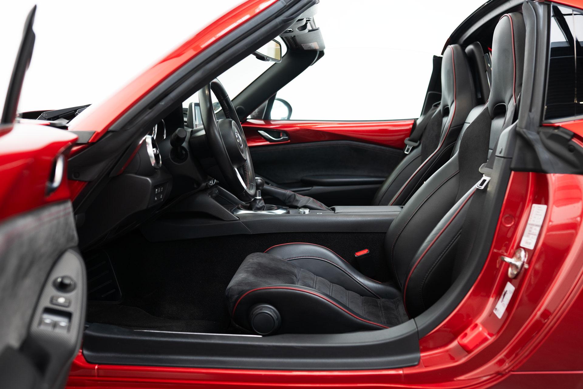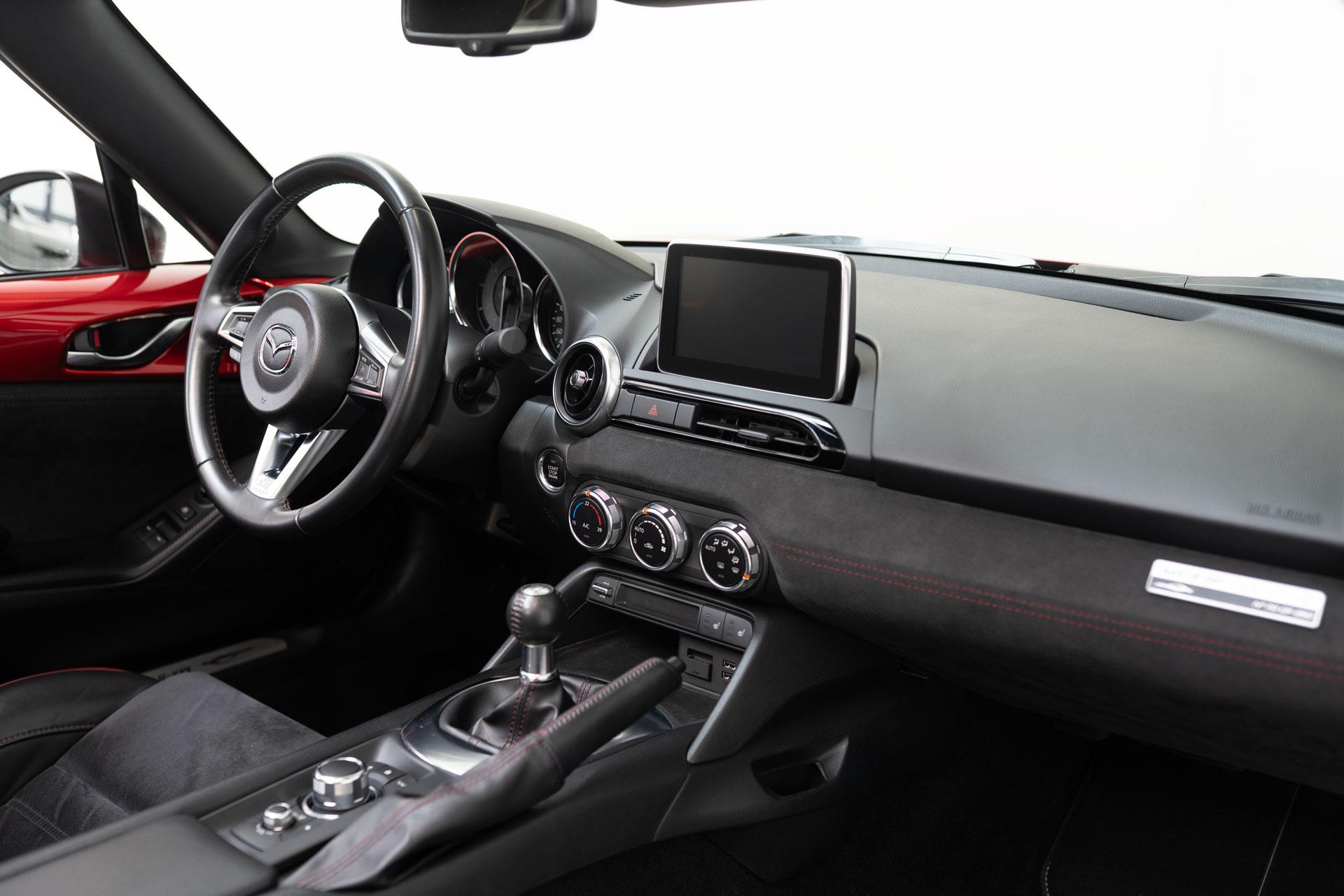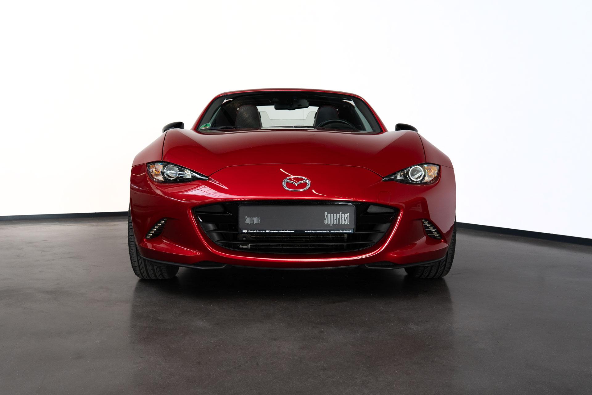 Dieser Mazda MX5 ist die #70 aus 250 Ignition Sondermodellen, die zum Start des RF unter Bewerbern ausgelost wurden. Das limitierte Ignition Sondermodell zeichnet sich durch die Acantara-Innenaustattung mit Recarositzen, die Bosesoundanlage, dem Bilsteinfahrwerk, den schwarzen Rädern und dem schwarzen Dach und schwarzen Spiegelkappen, Sonderfarben und dem großen Motor aus. Dieses Modell war seit 2017 in einer Hand und hat lediglich 48467km gelaufen und wurde nur im Sommer bewegt. Die MX5 ND sind berüchtigt für ihre werksseitig schwache Bremsanlage. Unser Auto wurde deshalb mit einer Stoptech 4-Kolben Bremsanlage versehen. Zudem hat das Auto eine zweiflutige Sportabgasanlage und dunkle Rückleuchten (orig. dabei). Ein seltenes Sondermodell für den MX5-Liebhaber.